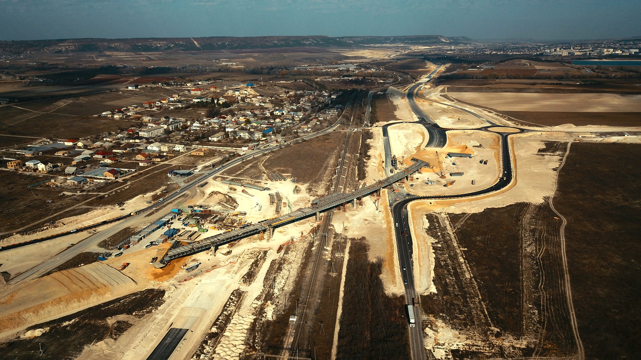 Помимо монтажа путепровода активно ведутся и работы на самой транспортной развязке в районе села Железнодорожное. Она необходима для сообщения с «Тавридой» близлежащих населенных пунктов, в том числе для съезда к селам Тургеневка, Танковое и поселку Сирень. На развязке ведется разработка грунта, устройство земполотна и основания дороги под щебеночно-песчаную смесь. Ее общая готовность составляет 75%, транспорт поедет по ней в следующем году.