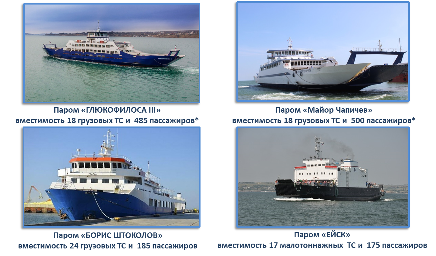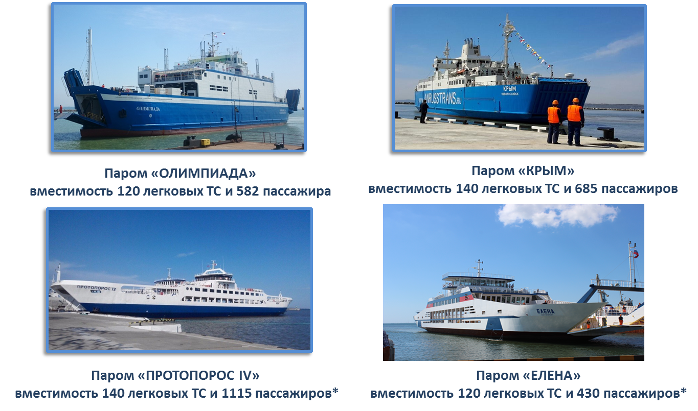 На линии Крым-Кавказ задействовано 8 судов-паромов: «Протопорос IV», «Олимпиада», «Крым», «Гликофилоуса-III», «Майор Чапичев», «Елена», «Ейск», «Борис Штоколов», два парома находятся в резерве «Аксёненко» и «Керченский 2».